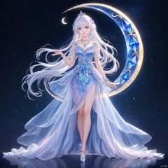 1 girl, solo, long hair, looking at the audience, bangs, blue eyes, jewelry, white hair, earrings, parted lips, necklace, parted bangs, gray eyes, crystal slipper, full body physiognomy, crescent moon,