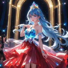 1 girl, solo, long hair, looking at the audience, bangs, blue eyes, jewelry, blue hair, earrings, parted lips, necklace, parted bangs, gray eyes, crystal slipper, bust, luminous, red skirt, Light