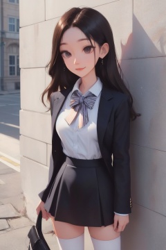 1girl,(best quality, highres:1.1),(realistic:1.4),(cowboy shot:1.3),detailed,clear sharp focus,highly detailed,(masterpiece, sidelighting, finely detailed beautiful eyes:1.2),hdr,professional lighting,amazing shadows,(school uniform:1.2),(school:1.1),checkered_skirt,blouse,ascot,black_skirt,socks_over_thighhighs,pantyhose,outdoors,shade,very long hair,wind,(smile:0.8),looking at viewer,hair_ornament,black dress,jkbb,nikon af-s 105mm f/1.4e ed,side_ahoge,side view,relying on something,rely on,wall,against_wall,standing against the wall,,backlight,lens_flare,backed against the wall,<lora:CH1:0.8>,