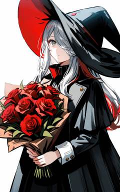 1girl, solo, hat, witch hat, flower, holding, long hair, hair over one eye, holding bouquet, bouquet, grey eyes, simple background, white background, black dress, multicolored hair, dress, red hair, long sleeves, black headwear, coat, parted lips, white hair <lora:XLTEST 06:0.75>