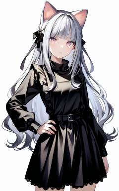 1girl, solo, white hair, belt, long sleeves, long hair, bangs,apron dress, upper body, looking at viewer, cowboy shot,(cat_ears),white background <lora:XLTEST 06:0.75>