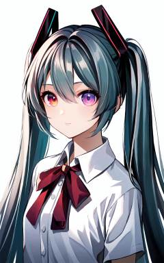 ribbon, 1girl, heterochromia, solo, twintails, long hair, red ribbon, hatsune miku, shirt, neck ribbon, very long hair, hair ribbon, white ribbon, looking at viewer, grey hair, white shirt, upper body, purple eyes, bangs, closed mouth, collared shirt <lora:XLTEST 06:0.75>