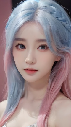 yanshangyue, 1girl, solo, xiaowu, BIG EYES, xxmix girl woman, <(masterpiece, realistic:1.3), (extremely intricate:1.2)>, portrait of a girl, sliver gradient hair, (sliver hair:1.1), (light blue hair:1.1), (pink hair:1.2), ((solid color background:1.3)), beautiful detailed glow, (detailed ice), beautiful detailed water, <lora:molixl3:0.6>