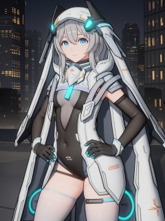 SKZYliweitanNC, 1girl, solo,blue eyes, leotard, bangs, elbow gloves, boots, hood, black gloves, hood up, hair between eyes, closed mouth, grey hair, white thighhighs, looking at viewer, headgear, covered navel, small breasts,cloak, <lora:SKZYliweitanNC:0.75>,cityscape, night,