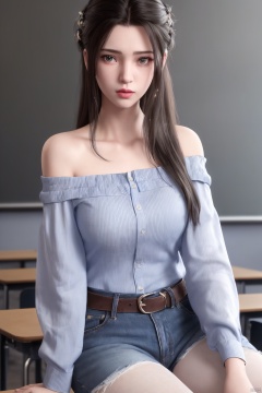 ((HRD, HUD, 8K)),((masterpiece, best quality)), highly detailed, soft light,1girl, solo, long hair, black hair, blue eyes, facial mark, forehead mark, crescent, lips, (off-shoulder shirt:1.2), denim shorts, black pantyhose, blurry background, classroom, chalkboard, sitting, cowboy shot, looking at viewer,