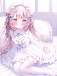 white thighhighs, frilled thighhighs, no shoes, pillow, ribbon, gothic lolita, white dress,