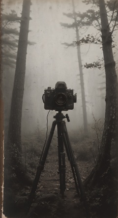 yeelowed old photo, damaged, light leaks, early 20th century, dust, scratches, award winning masterpiece, foggy, close-up of a camera on tripod, forest, obscured trees, outdoor photography, professional camera equipment, tranquil scene, ground level, no people, <lora:foggy_v1.0:0.6>, <lora:oldPhotoV1:0.9>,