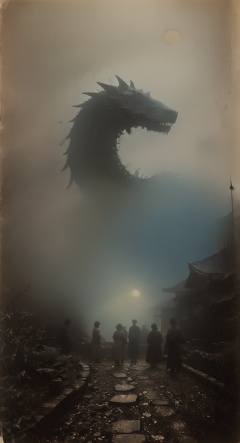 sepia old photo, light leaks, damaged, early 19th century, fantasy, ancient asian culture, special effects, outdoor, foggy background, a couple and a huge sleeping dragon head together in a group photo, <lora:oldPhotoV1:0.9>, <lora:foggy_v1.0:1>,