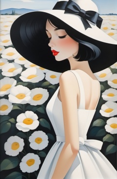 <lora:inset02-000016:0.6>,1girl, solo, breasts, blush, short hair, bangs, black hair, hat, dress, cleavage, medium breasts, closed mouth, standing, collarbone, closed eyes, flower, sleeveless, white dress, makeup, sleeveless dress, shadow, white headwear, floral print, white flower, lipstick, facing viewer, sun hat, arms at sides, red lips, sundress