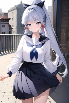 (masterpiece, best quality:1.2),insanely detailed,absurdres,ultra-highres,ultra-detailed,best quality,slender,kawaii,perfect symmetrical face,ultra cute girl,ultra cute face,ultra detailed eyes,ultra cute,ultra beautifu,<lora:kamisato ayaka-000008:1>,kamisato ayaka \(heytea\),kamisato ayaka,1girl,solo,school uniform,grey eyes,black footwear,breasts,blue hair,ribbon,white socks,hair ribbon,long sleeves,sailor collar,ponytail,serafuku,pleated skirt,mole under eye,white sailor collar,alternate costume,long hair,blue skirt,outdoors,standing,
