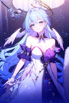 masterpiece,official art,extremely detailed cg unity 8k wallpaper,highly detailed,absurdres,8k resolution,1girl,solo,bow,bare shoulders,bangs,blue eyes,dress,wings,strapless,jewelry,breasts,blue hair,earrings,halo,hair intakes,head wings,strapless dress,robin,highres,smile,parted lips,blush,<lora:robin-str-v1cl:1>,