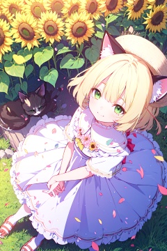 (from above),(Looking up:1.5),sunflower,Straw hat,white dress,Standing on grass,flower,green eyes,((tear ,petal,falling petals,cat ears,smile,stand, blonde hair)),(looking atviewer),