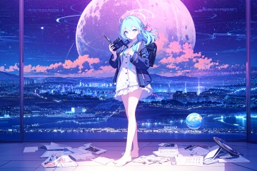 (((full body))), finely detail, Depth of field, (((masterpiece))), ((extremely detailed CG unity 8k wallpaper)), best quality, high resolution illustration, Amazing, intricate detail, (best illumination, best shadow, an extremely delicate and beautiful), star_\(sky\), starry_sky, space, shooting_star, 1girl, constellation, planet, night_sky, pencil, starry_sky_print, blue_eyes, night, palette_\(object\), earth_\(planet\), feet, phone, sky, solo, moon, barefoot, eraser, long_sleeves, blue_hair, book, looking_at_viewer, telescope, pen, shirt, cellphone, smile, card, paper, star_\(symbol\), handheld_game_console, notebook, galaxy, crescent_moon, clock, cloud, white_shirt, milky_way, cityscape, globe, light_particles