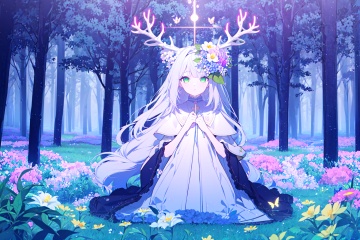 (masterpiece:1.2),high_quality,occultism,Aestheticism Painting,(flat color),best quality,soft lighting,(depth_of_field:1.3),(solo:1.4),[close-up],(1girl),detailed beautiful green eyes,(silvery hair),deer_ears,messy_long_hair,beautiful_deer_antlers,archbishop_robe,largr_sleeve,grey_cloak,blooming,looking_at_viewer,lily (flower),colorful butterfly,(fantastic colorful),fluorescence,(forest:1.25),tree_shade,(flowers meadows:1.4),