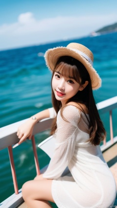1girl, hat, long hair, solo, outdoors, black hair, dress, white dress, sun hat, looking at viewer, day, black eyes, chair, beach, ocean, blurry, smile, parted lips, dutch angle, straw hat, lipstick, bangs, standing, from side, makeup, water, scenery, sky, teeth, red lips, lips, brown eyes, blurry background, holding, depth of field, sitting, realistic, looking to the side, long sleeves, railing, pale skin, looking back, shore, leaning forward, sundress, breasts, blunt bangs, see-through, brown hair, umbrella