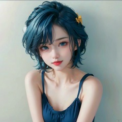 1girl, solo, breasts, looking at viewer, blush, smile, short hair, bangs, blue eyes, simple background, shirt, white background, sitting, closed mouth, blue hair, collarbone, swimsuit, full body, white shirt, hairband, small breasts, barefoot, sleeveless, sailor collar, one-piece swimsuit, bare arms, bare legs, sleeveless shirt, toes, wariza, blue sailor collar, bright pupils, white pupils, swimsuit under clothes, yellow hairband, tear,lana \(pokemon\)