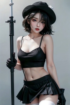 1girl, solo, breasts, looking at viewer, short hair, blue eyes, skirt, black hair, thighhighs, gloves, hat, navel, holding, medium breasts, standing, weapon, cowboy shot, pleated skirt, small breasts, parted lips, black gloves, midriff, miniskirt, black skirt, stomach, white thighhighs, lips, zettai ryouiki, crop top, black headwear, eyepatch, suspenders, contrapposto, mechanical arms