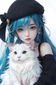 1girl,twintails,solo,jewelry,earrings,hat,hair ornament,looking at viewer,hatsune miku,blue hair,blue eyes,white background,long hair,blue headwear,plaid,bow,beret,parted lips,hair between eyes,plaid dress,holding,bangs,upper body,simple background,rabbit,ribbon,to-style,beautiful eyes,depth of field,moyou