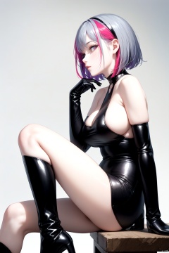 best quality,4k,8k,highres,masterpiece,ultra-detailed,realistic,photorealistic,photo-realistic,HDR,UHD,studio lighting,1girl,bare shoulders,black footwear,black gloves,boots,breasts,closed mouth,clothing cutout,colored inner hair,detached sleeves,foot out of frame,gloves,grey hair,head rest,high heel boots,high heels,knee boots,large breasts,long sleeves,multicolored hair,profile,purple eyes,red hair,short hair,sideboob,solo,streaked hair,thigh cutout,