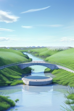 pd_3dcaodi, spring, nature, river, bridge, no humans, landscape, outdoor, blue sky, white clouds, prairie, water, rich details,<lora:PD_3Dcaodi_V1-000014:0.7>,