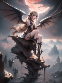 ((best quality)),((masterpiece)),(detailed),alluring succubus,ethereal beauty,perched on a cloud,(fantasy illustration),enchanting gaze,captivating pose,delicate wings,otherworldly charm,mystical sky,(Luis Royo:1.2),(Yoshitaka Amano:1.1),moonlit night,soft colors,(detailed cloudscape:1.3),(high-resolution:1.2),