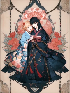 style\(ukiyoe\),japanese line art,two school girls in a garden tying each other up with chains and rope,knots,bdsm,floral damask background,in the style of  takato yamamoto,