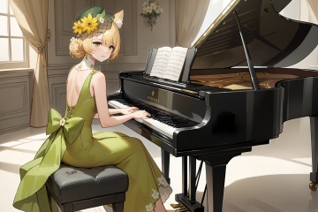 masterpiece, best quality,1girl, flower, solo, green eyes, hair ornament, hair flower, animal ears,blonde hair,hat, hat flower,piano,Playing the piano,Sitting,Sitting and playing the piano,Dress,