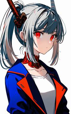 1girl, horns, solo, simple background, ponytail, red eyes, white background, blue jacket, jacket, dragon horns, grey hair, open jacket, looking at viewer, shirt, sidelocks, portrait, open clothes, upper body    <lora:XLTEST 10:0.75>