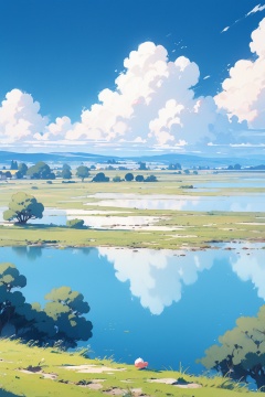solo,outdoors,sky,day,cloud,water,tree,blue_sky,cloudy_sky,grass,scenery,horizon,kirby,