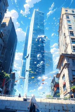 long_hair,multiple_girls,white_hair,outdoors,sky,day,cloud,blue_sky,building,scenery,fish,bubble,city,underwater,skyscraper,whale,