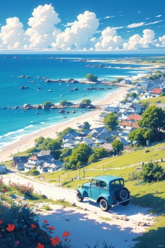 flower, outdoors, sky, day, cloud, water, tree, blue_sky, no_humans, ocean, beach, cloudy_sky, grass, ground_vehicle, building, scenery, motor_vehicle, horizon, car, road, house