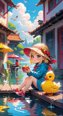 comic_style, children's_painting_style, bird, hat, fruit, animalization, clothed, sitting, water, no humans, food, cloud, fish, chain, Animal, sky, shadow, long sleeves, duck, flat color, outdoors, furry, smoke, blonde hair, dog, looking at another, standing, baby, cat,
