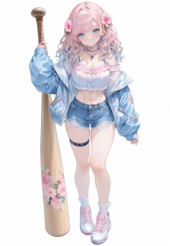 (best quality), ((masterpiece)), (highres), illustration, original, extremely detailed,  <lora:幻想华服萝莉:0.6>1girl, solo, shorts, hair ornament, jacket, shoes, blue eyes, hair flower, blue jacket, socks, open clothes, choker, frills, white socks, crop top, baseball bat, flower, midriff, white footwear, navel, long hair, full body, short shorts, open jacket, looking at viewer, white background, denim, simple background, long sleeves, frilled shirt, shirt, standing, bangs, camisole, holding, thigh strap, off shoulder, denim shorts, breasts, jewelry, blue shorts, closed mouth, pink flower, wavy hair, sneakers, smile, thighs, earrings, necklace, medium breasts, stomach