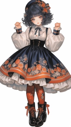 (best quality), ((masterpiece)), (highres), illustration, original, extremely detailed,  <lora:幻想华服萝莉:0.6>1girl, solo, white background, pantyhose, long sleeves, simple background, hat, dress, black footwear, boots, bangs, looking at viewer, frills, full body, black hair, short hair, grey eyes, ribbon, blunt bangs, curly hair, puffy sleeves, hands up, neck ribbon, print legwear, floral print, center frills, standing