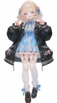 (best quality), ((masterpiece)), (highres), illustration, original, extremely detailed,  <lora:幻想华服萝莉:0.6>1girl, solo, thighhighs, blue eyes, dress, garter straps, white background, open mouth, full body, bow, blue dress, jacket, simple background, looking at viewer, smile, hair ornament, blonde hair, black footwear, long sleeves, white thighhighs, blue bow, ribbon, black jacket, braid, standing, shoes