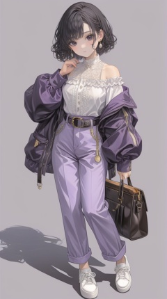 (best quality), ((masterpiece)), (highres), illustration, original, extremely detailed,  <lora:幻想华服萝莉:0.6>1girl, solo, off shoulder, shadow, black hair, shoes, white background, pants, full body, bag, jewelry, belt, holding bag, simple background, earrings, jacket, holding, short hair, standing, white footwear, hand in pocket, shirt, purple pants, bare shoulders, long sleeves, purple jacket, puffy sleeves, shirt tucked in, black eyes, puffy long sleeves, looking at viewer