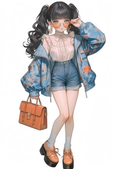 (best quality), ((masterpiece)), (highres), illustration, original, extremely detailed,  <lora:幻想华服萝莉:0.6>1girl, solo, long hair, white background, bangs, simple background, shorts, jacket, black hair, frills, sunglasses, shoes, socks, bag, looking at viewer, looking over eyewear, long sleeves, full body, white socks, blunt bangs, tinted eyewear, adjusting eyewear, twintails, jewelry, standing, earrings, blue eyes