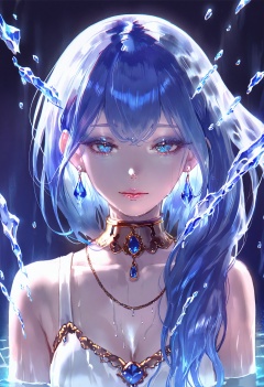 masterpiece, best quality,1girl, solo, blue eyes, blue hair, jewelry, looking at viewer, earrings, portrait, water, gem, bangs, blue theme, hair between eyes, parted lips, collarbone, liquid hair, blue gemstone, glint, eyelashes, breasts, medium breasts, neck ring, blue background, water drop, crystal hair, hair behind ear, cleavage, straight-on, hydrokinesis, necklace, sparkle, long hair <lora:1111111XLlokr8f-000187:0.95>