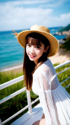1girl, hat, long hair, solo, outdoors, black hair, dress, white dress, sun hat, looking at viewer, day, black eyes, chair, beach, ocean, blurry, smile, parted lips, dutch angle, straw hat, lipstick, bangs, standing, from side, makeup, water, scenery, sky, teeth, red lips, lips, brown eyes, blurry background, holding, depth of field, sitting, realistic, looking to the side, long sleeves, railing, pale skin, looking back, shore, leaning forward, sundress, breasts, blunt bangs, see-through, brown hair, umbrella