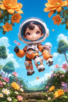 1girl,chibi, full body, robot, astronauts outdoors, flowers, trees,