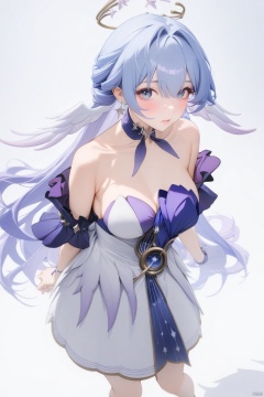 1girl,robinSR,Medium Shot,robinSR, bangs, blue eyes, dress,bow, hair between eyes, bare shoulders, jewelry, medium breasts, blue hair, earrings, wings, strapless, halo, hair intakes, head wings, strapless dress,