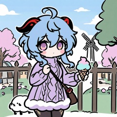 <lora:flat-color-style_A3.1_XL:0.8>,flat-color-style, chibi, 1girl, ganyu \(genshin impact\), solo, outdoors, long hair, goat horns, ice cream, horns, flower, purple eyes, blue hair, sweater, petals, looking at viewer, pantyhose, food, bag, turtleneck, ahoge, bangs, blush, windmill, purple flower, sheep, turtleneck sweater, holding, fence, breasts, cloud, day, long sleeves, sky, handbag, shoulder bag, building, falling petals, cowboy shot, closed mouth, floating hair, dress, animal, black pantyhose, purple sweater, hair between eyes, pink flower, medium breasts, standing, sidelocks, cable knit, blue sky, tree, holding food