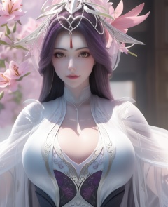 <lora:557-DA-百炼成神-玉婆婆:0.8>(,1girl, ,best quality, ),looking at viewer,  ,ultra detailed 8k cg,ultra detailed background,ultra realistic 8k cg,1girl, solo,(bare shoulders:0.85),(masterpiece, best quality),((oil painting style)),sexy young lady,(beautiful face and eyes),(upper body:1.5),(whole body:1.05),(single person:1.2),surrounded by flowers, (lily), roses, floret, vegetation, white, purple, purplish pink,Impressionism,colorful,(Breast size:1.3),(cleavage),