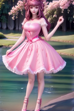 1girl, solo, long hair, breasts, looking at viewer, smile, bangs, brown hair, hair ornament, dress, bow, brown eyes, jewelry, medium breasts, standing, full body, flower, hair bow, outdoors, sky, day, cloud, hand up, hair flower, water, high heels, bracelet, tree, blue sky, petals, floral print, pink bow, cherry blossoms, pink dress, mountain, skirt hold