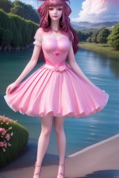 1girl, solo, long hair, breasts, looking at viewer, smile, bangs, brown hair, hair ornament, dress, bow, brown eyes, jewelry, medium breasts, standing, full body, flower, hair bow, outdoors, sky, day, cloud, hand up, hair flower, water, high heels, bracelet, tree, blue sky, petals, floral print, pink bow, cherry blossoms, pink dress, mountain, skirt hold