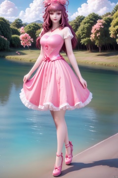 1girl, solo, long hair, breasts, looking at viewer, smile, bangs, brown hair, hair ornament, dress, bow, brown eyes, jewelry, medium breasts, standing, full body, flower, hair bow, outdoors, sky, day, cloud, hand up, hair flower, water, high heels, bracelet, tree, blue sky, petals, floral print, pink bow, cherry blossoms, pink dress, mountain, skirt hold
