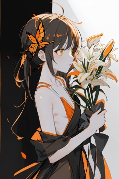 butterfly hair ornament,flat chest,(ambiguous gender:1.2),plain clothes,holding a bouquet of lilies,(from side:0.7) (sketch:1.3),charcoal drawing,rough drawing,selective color monochrome((White, Yellow, Orange)),partial coloring,golden edge,