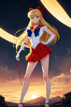 1girl,looking at viewer,solo,long hair,very long hair,blonde hair,blue eyes,choker,tiara,sailor collar,hair bow,bow,gloves,skirt,high heels,sailor senshi uniform,standing,<lora:Minako:0.8>,Minako_CYQL,bust,beautiful face,beautiful eyes,glossy skin,shiny skin,River bend, Photography, Sunset, Reflections, Tranquility, Scenic beauty,beautiful detailed sky,beautiful detailed glow,posing in front of a colorful and dynamic background,masterpiece,best quality,beautiful and aesthetic,contrapposto,female focus,wallpaper,fashion,
