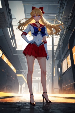 1girl,looking at viewer,solo,long hair,very long hair,blonde hair,blue eyes,choker,tiara,sailor collar,hair bow,bow,gloves,skirt,high heels,sailor senshi uniform,standing,<lora:Minako:0.8>,Minako_CYQL,panorama,beautiful face,beautiful eyes,glossy skin,shiny skin,Modern subway station, Platforms, Trains, Commuters, Connectivity,beautiful detailed sky,beautiful detailed glow,posing in front of a colorful and dynamic background,masterpiece,best quality,beautiful and aesthetic,contrapposto,female focus,wallpaper,fashion,