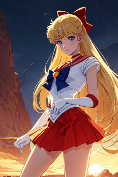 1girl,looking at viewer,solo,long hair,very long hair,blonde hair,blue eyes,choker,tiara,sailor collar,hair bow,bow,gloves,skirt,high heels,sailor senshi uniform,standing,<lora:Minako:0.8>,Minako_CYQL,bust,beautiful face,beautiful eyes,glossy skin,shiny skin,River, Canyon, Sunset, Golden light, Shadows, Peacefulness,beautiful detailed sky,beautiful detailed glow,posing in front of a colorful and dynamic background,masterpiece,best quality,beautiful and aesthetic,contrapposto,female focus,wallpaper,fashion,